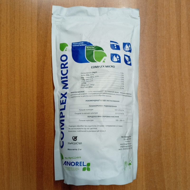 Удобрение Микрокомплекс (Complex Micro) – это кристаллическое водорастворимое удобрение, которое содержит смесь хелатов цинка, железа, марганца, меди, бора, молибдена, серы и магния.