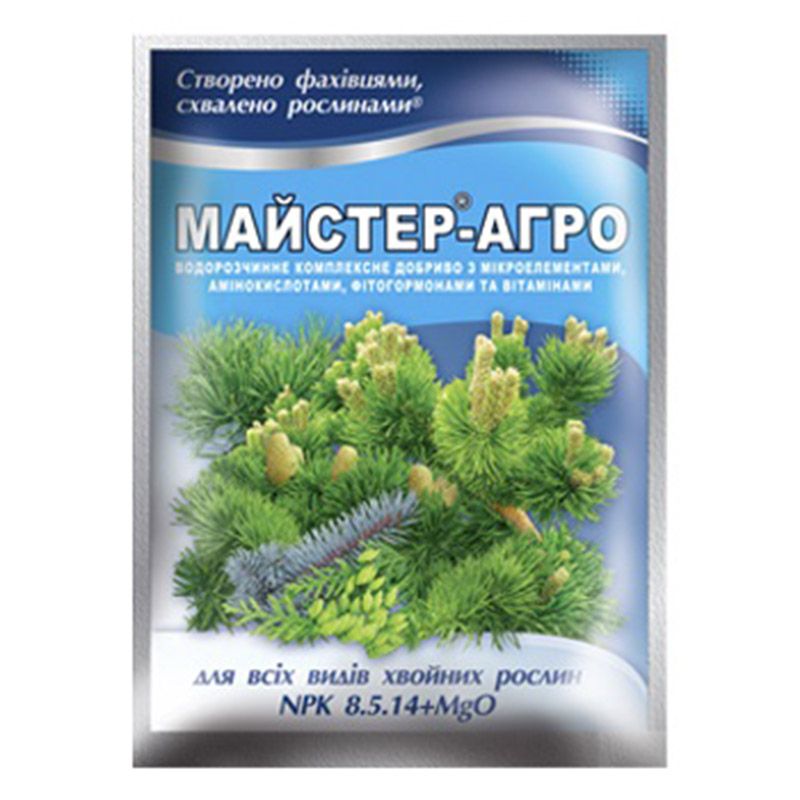Удобрение минеральное Мастер-Агро для хвойных растений – универсальное безхлорное, водорастворимое комплексное минеральное удобрение для корневой подкормки комнатных и уличных хвойных растений.