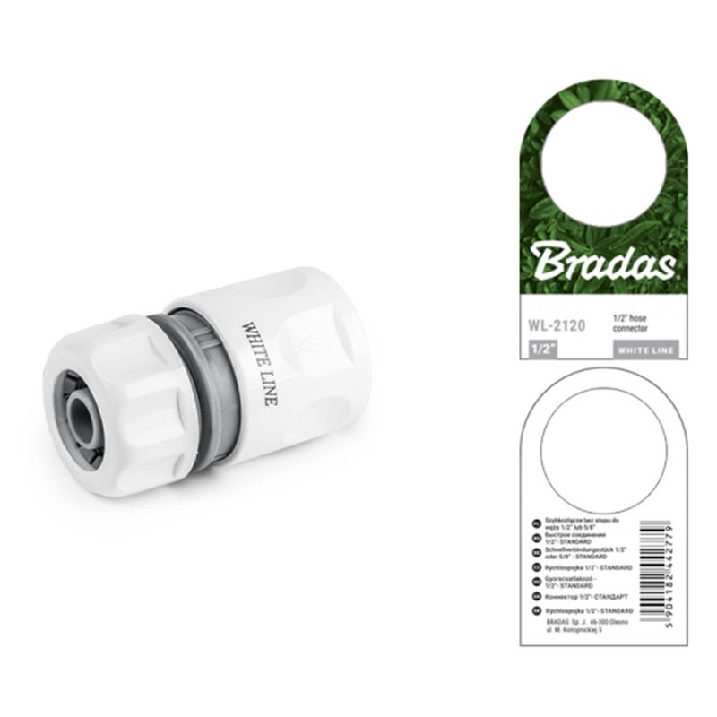 Коннектор выполнен в белом и сером цветах, что является отличительной особенностью соединительной и поливочной арматуры серии WHITE LINE от Bradas и сочетается с любым поливочным шлангом.