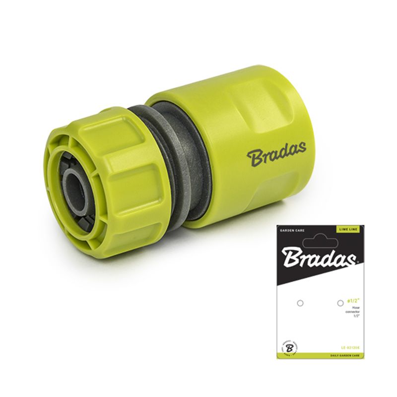 Коннектор выполнен в салатовом и сером цветах, что является отличительной особенностью соединительной и поливочной арматуры серии LIME LINE от Bradas и сочетается с любым поливочным шлангом.