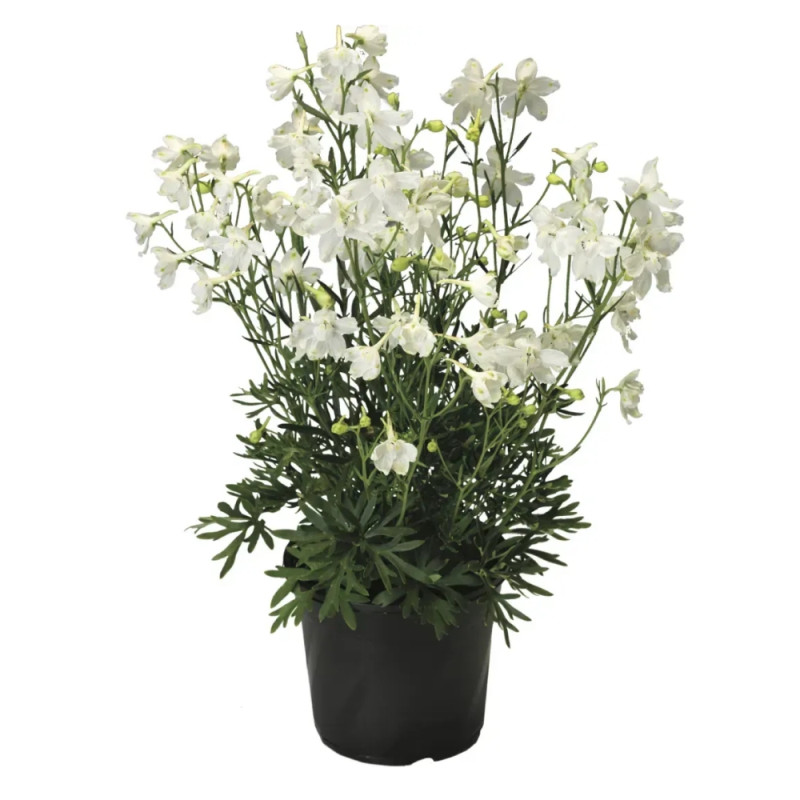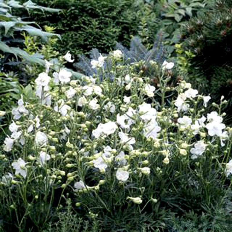 Дельфиниум крупноцветковый Делфикс белый (Delphinium grandiflorum Delfix white) – компактное и хорошо разветвленное растение.