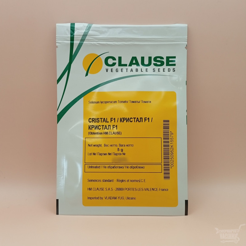 На фото предоставлена оригинальная упаковка томатов «Кристал F1» номиналом 1г компании «Clause/Клоз». Семена хранятся в упаковке с плотного триплекса. Это позволяет защитить семена от солнечного влияния, повреждений и лишней влаги. Информация на упаковке дана 3 языками: английским, украинским и российским .