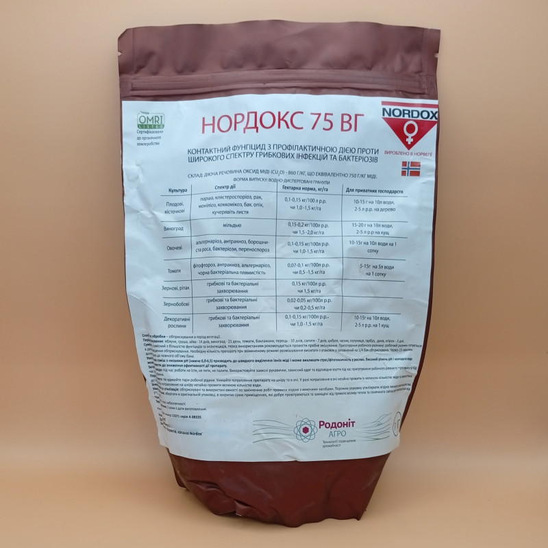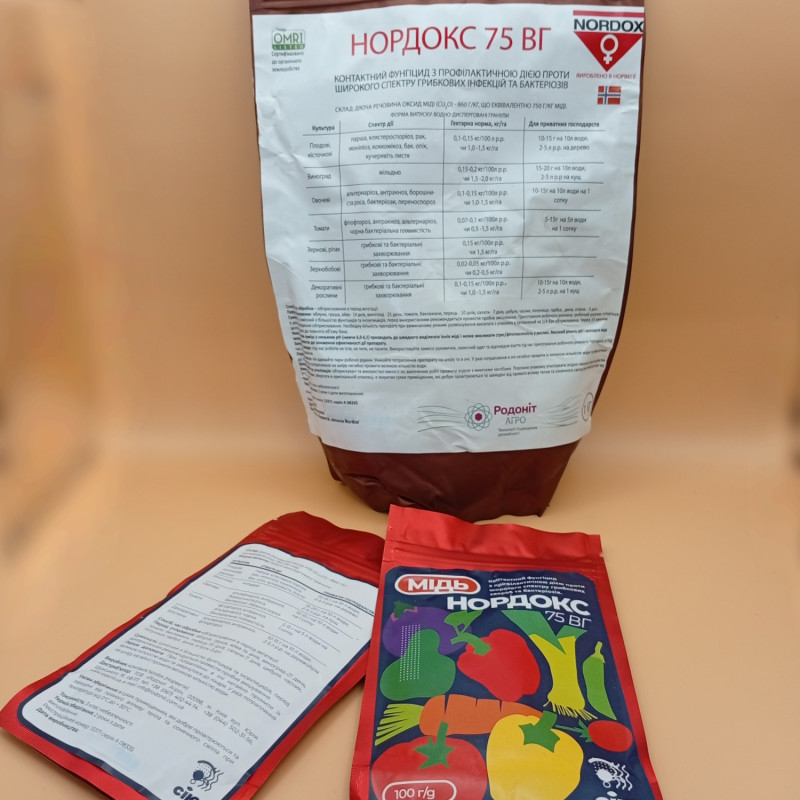 Фунгицид Нордокс 75 WG (Nordox) – надежный контактный фунгицид/бактерицид с профилактическим действием против широкого спектра грибковых инфекций и бактериозов полевых и овощных культур, в открытом и закрытом грунте, на разных плодовых и косточковых деревьях, ягодниках, винограде, цветах и декоративных растениях.