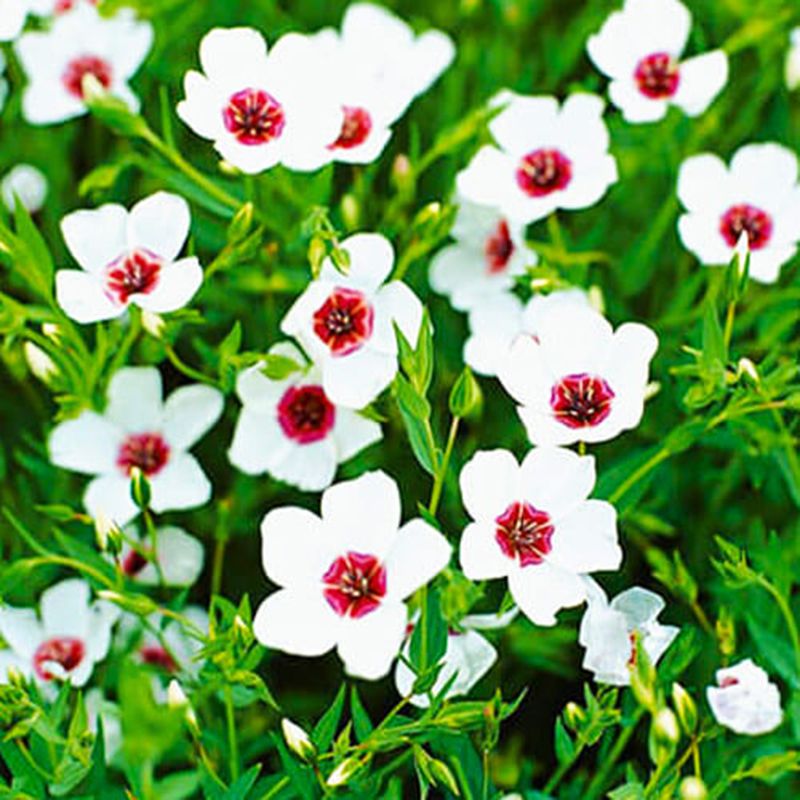 Лен крупноцветковый белый с красной серединкой – необычной красоты цветок, способный превратить любое место в настоящий небесный ковер.