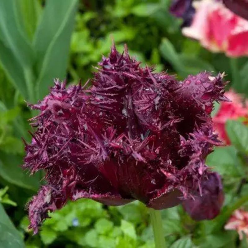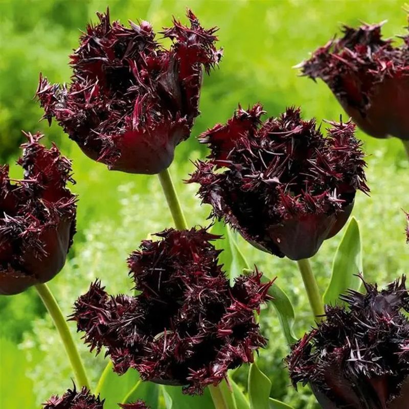 Каждый цветок имеет насыщенно-красные лепестки с черным отливом и эффектной оторочкой по краям. Большие, долговечные цветки поднимаются на изящных стеблях. Сам цветок большой, красивой формы, достаточно плотный, на солнце полностью не распускается.