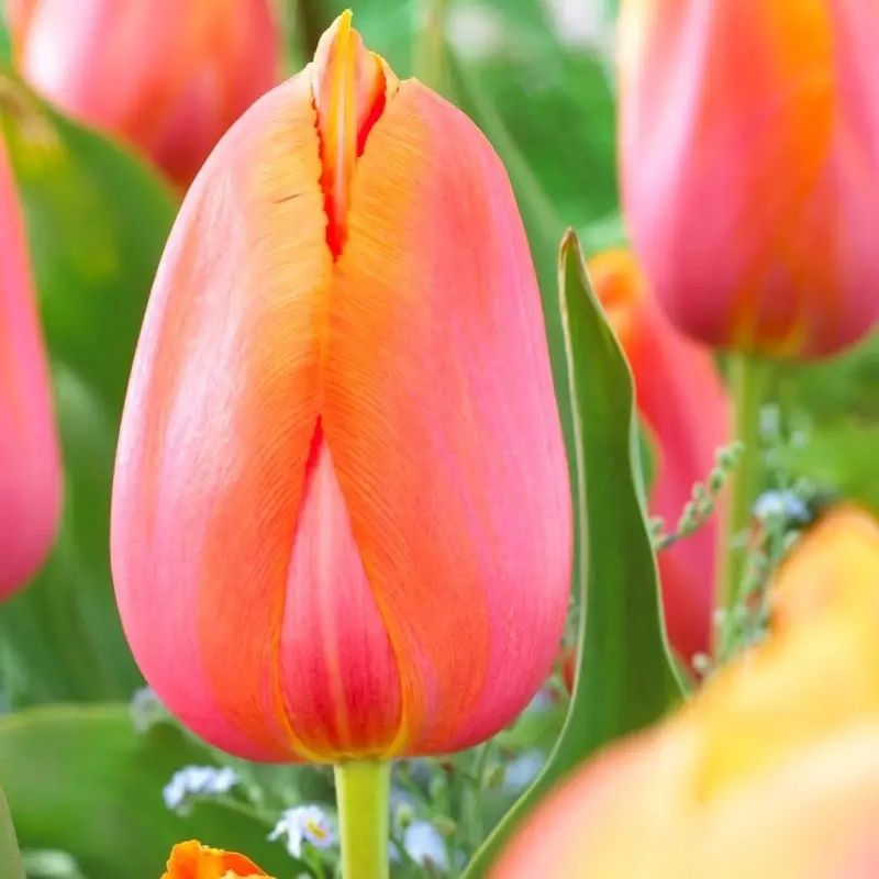 Высота тюльпана Дордонь достигает 40 см с темно-зелеными прикорневыми листьями сизого оттенка.