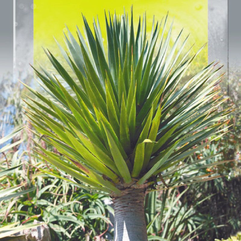 Растение формирует ствол дерева высотой до 100 см, на вершине которого располагается розетка длинных саблевидных листьев серо-зеленого цвета со светлыми контрастными жилками.