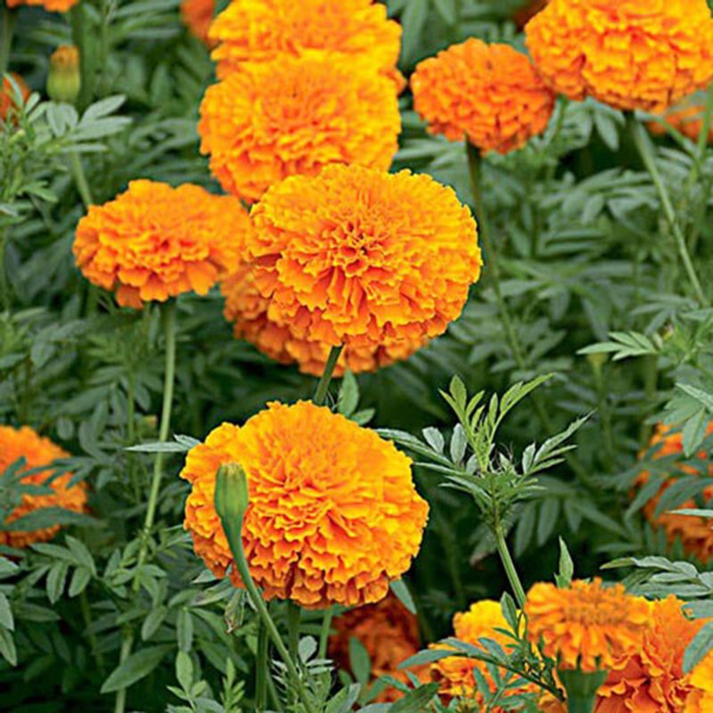 Бархатцы Мандарин оранжевые – растение однолетнее, компактное, высотой до 90 см. Это большие махровые шапки оранжевого цвета.