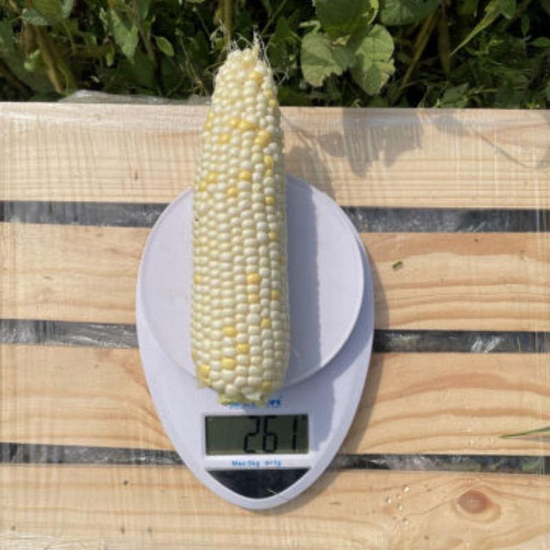 Характеристика плодов – Кочаны белого цвета, длиной 20-22 см. Диаметр кочана – 4,5-5 см. Количество рядов зерен: 16-18. Суперсладкий нежный вкус.