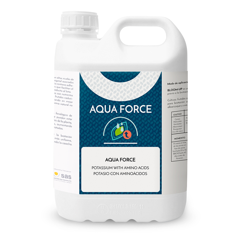 Aqua Force изготовлен на основе специфических аминокислот и осмопротекторов (222,1 г/л). В состав входят 6,63% свободных аминокислот, 2,65% азота, 3,70% оксида калия. рН 1.105 ± 0.01.