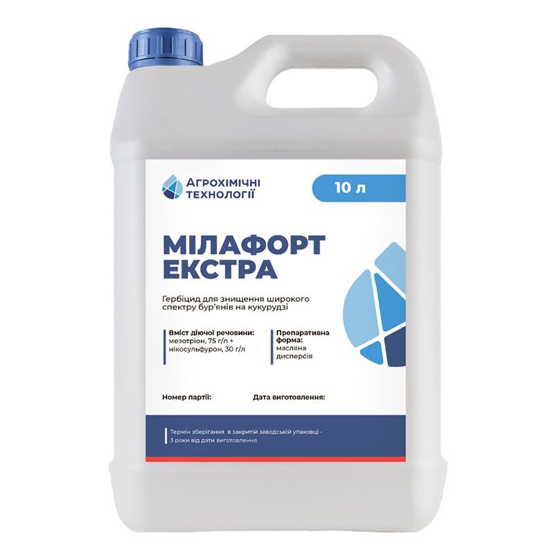 Гербицид Милафорт Экстра – послевсходовый гербицид с широким окном применения для защиты от широкого спектра сорняков и падалиц в посевах кукурузы (амброзия полонистая, мышей, пырей, лебеда белая, латук татарский, горчак, ваточник сирийский).
