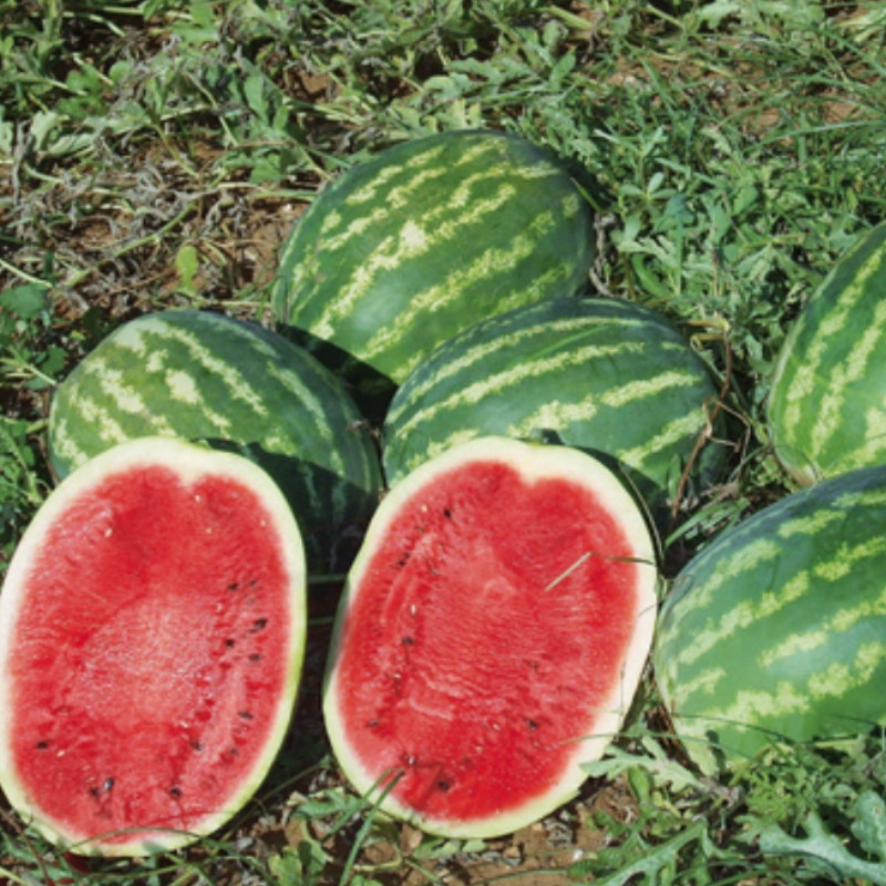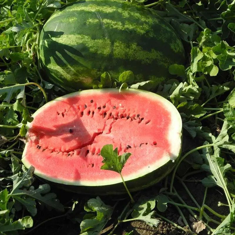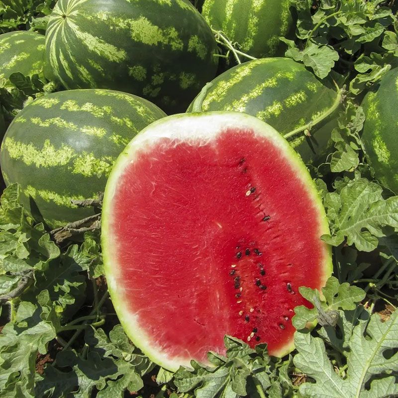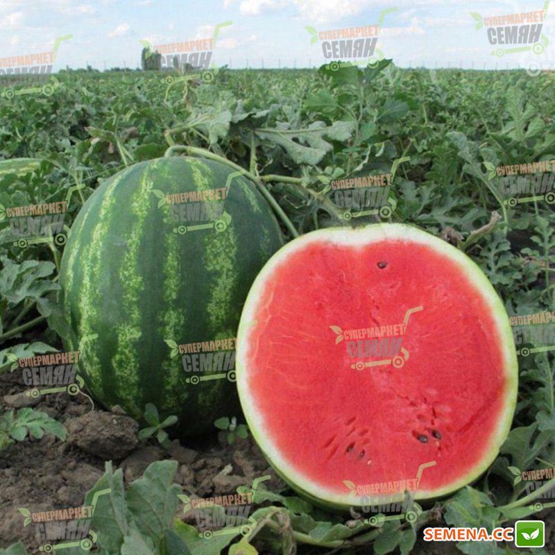 Характеристика плодов – Плоды гибрида округлой формы, масса в среднем составляет 11-13 кг, однако встречаются экземпляры и более 16 кг. Поверхность гладкая, без трещин и деформаций. Кожа плодов со светло-зелеными полосами, плотная, толстая. Это позволяет без труда транспортировать ягоды на большие расстояния. Мякоть плодов насыщенного красного оттенка, хрустящая, с высокой сахаристостью (12% и выше), без волокон. Семенная камера небольшая, семена темного цвета.