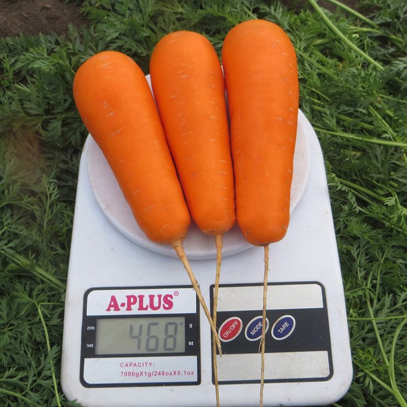 Характеристика плодов – Однородные гладкие корнеплоды, без глазков, насыщенного оранжевого цвета, как снаружи, так и внутри. Длина 16 см, диаметр в верхней части 4-5 см, в нижней 2,5-3 см. Форма типичная – коническая с закруглением в конце. Прекрасное качество плодов. Сердцевина небольшая, не трескающаяся при уборке.