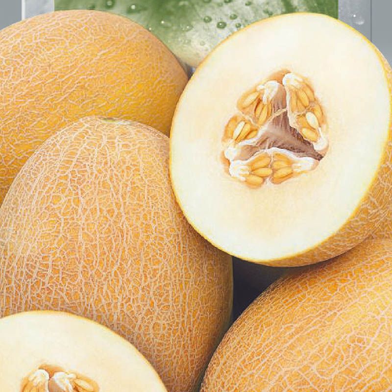 Характеристика плодов – Плоды округлой и округло-плоской формы, желто-оранжевого цвета, со сплошной сеткой. Средняя масса плода от 2-2,8 кг до 4 кг. Мякоть средней толщины (до 2,5-3 см), белого цвета, нежная, сочная, очень сладкая.