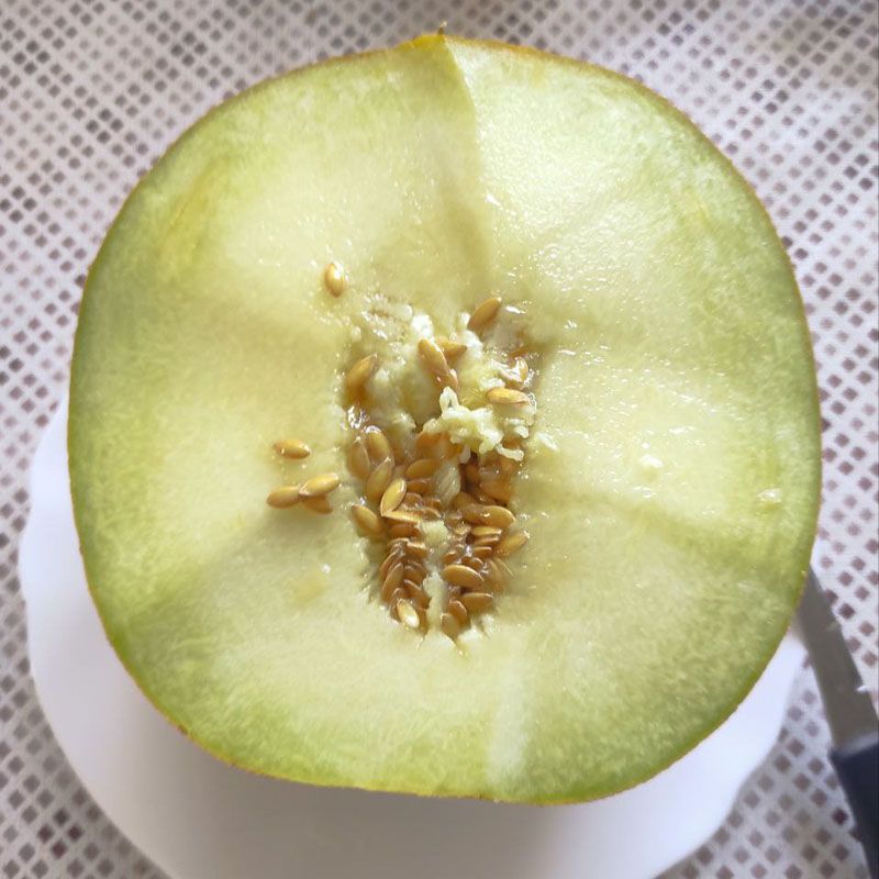Характеристика плода – Дыня суперпродуктивная, с красивыми, сладкими, округлыми плодами. Желтая поверхность с ярко выраженной сеткой. Цвет мякоти – оранжевый. Вес плодов – 1,5-2 кг.
