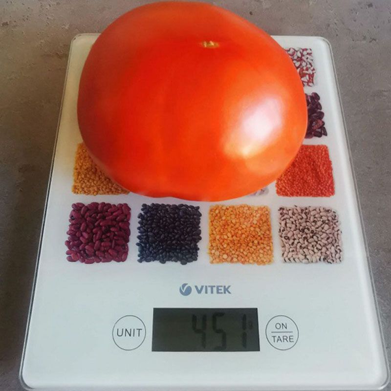 Характеристика плодов – Великоплодный красный биф-томат, слегка ребристый. Мясистый и сочный плод. Вес – 220-450 г.