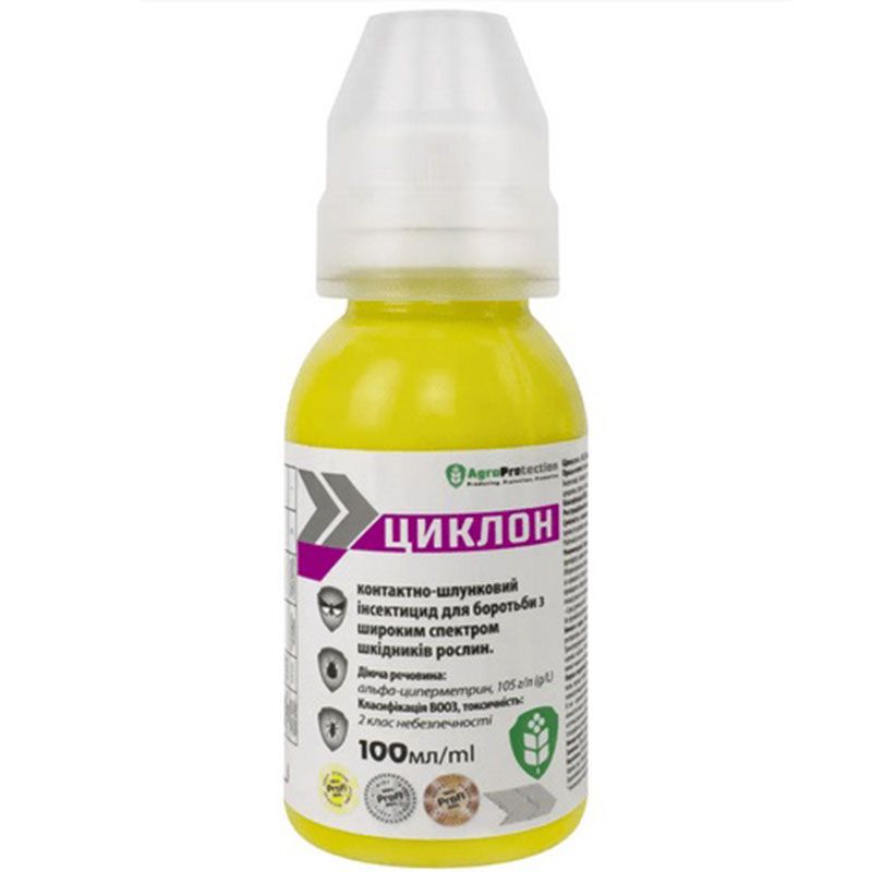 Инсектицид Циклон успешно используется для защиты яблони, груши, персика, зерновых колосовых культур, рапса, свеклы сахарной, гороха, томатов против клопа вредной раковины, пьяницы, трипсов, хлебной жужелицы, злаковой мухи, рапсовых цветков. , гороховой зерновки, плодожорки, луговой бабочки, блошки, колорадского жука, листовки.