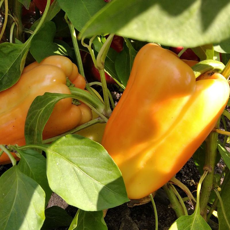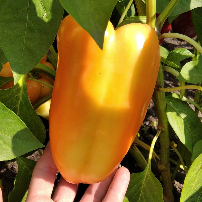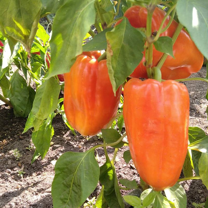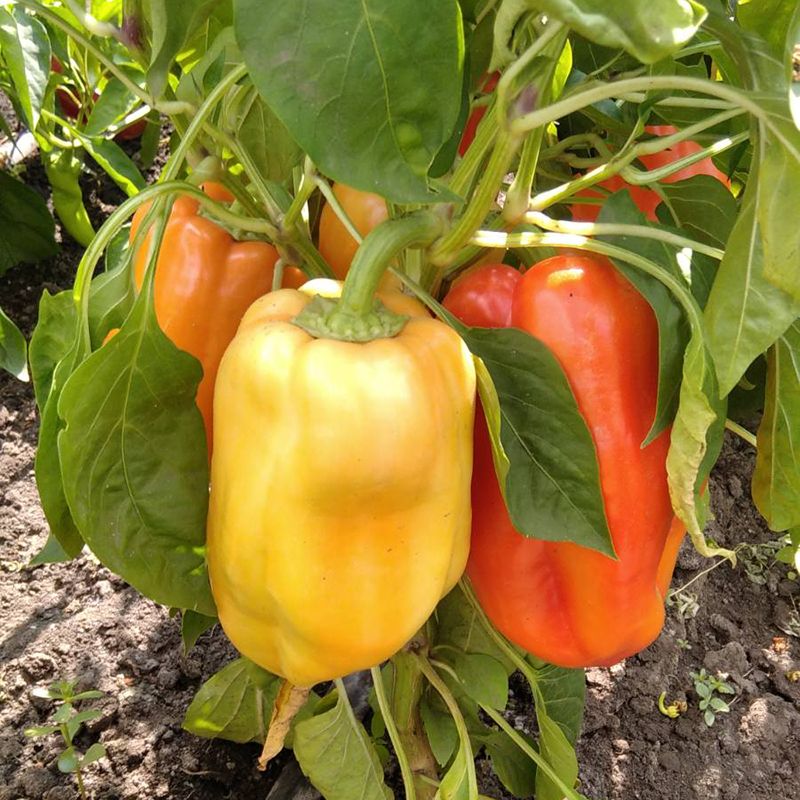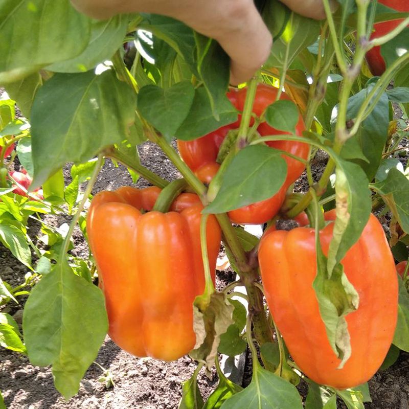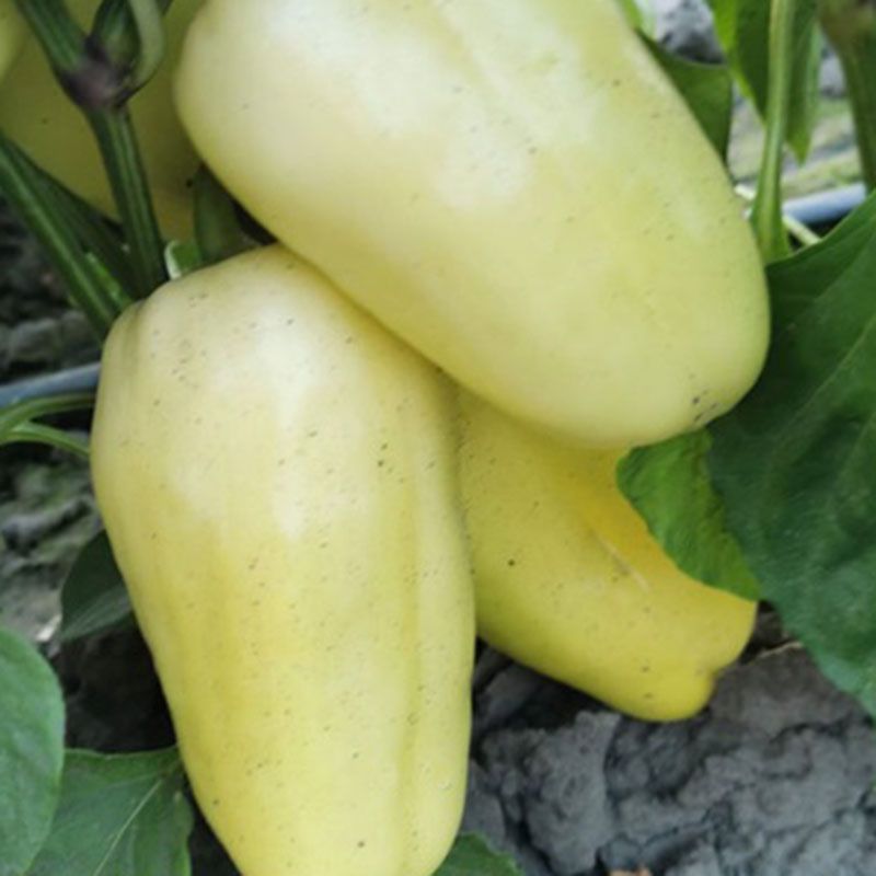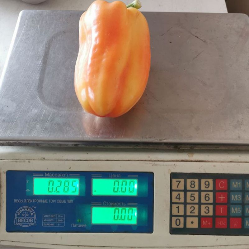 Характеристика плодов – Сладкий перец, кубообразной формы. Цвет в техническом созревании – кремовый, в биологическом – красный. Иногда встречаются плоды оранжевого цвета. Вес плода – 150-180 г. Длина плода – 11 см, диаметр – 8 см. Толщина стенки – 5-6 мм. Имеет длинную плодоножку, плоды экспортного качества.