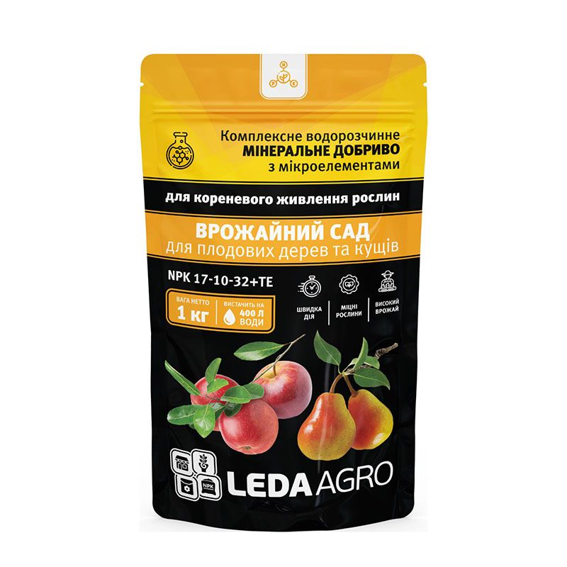 Удобрение Урожайный сад NPK 17-10-32+ТЕ водорастворимое – это комплексное водорастворимое NPK – удобрение с высоким содержанием калия.