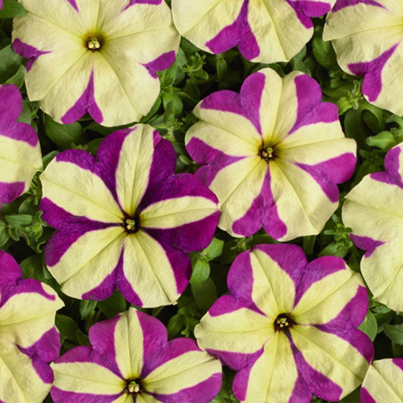 Петуния Лавина F1 пурпурно-желтая звезда – уникальный двухцветный сорт, до сих пор невиданное и высоко привлекательное сочетание пурпурной и желтой окраски, образующей на цветках рисунок в форме звезды. Цветки диаметром 6-8 см.