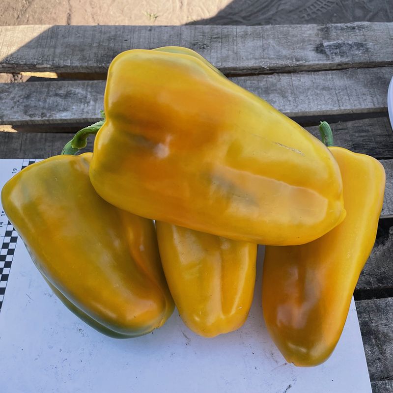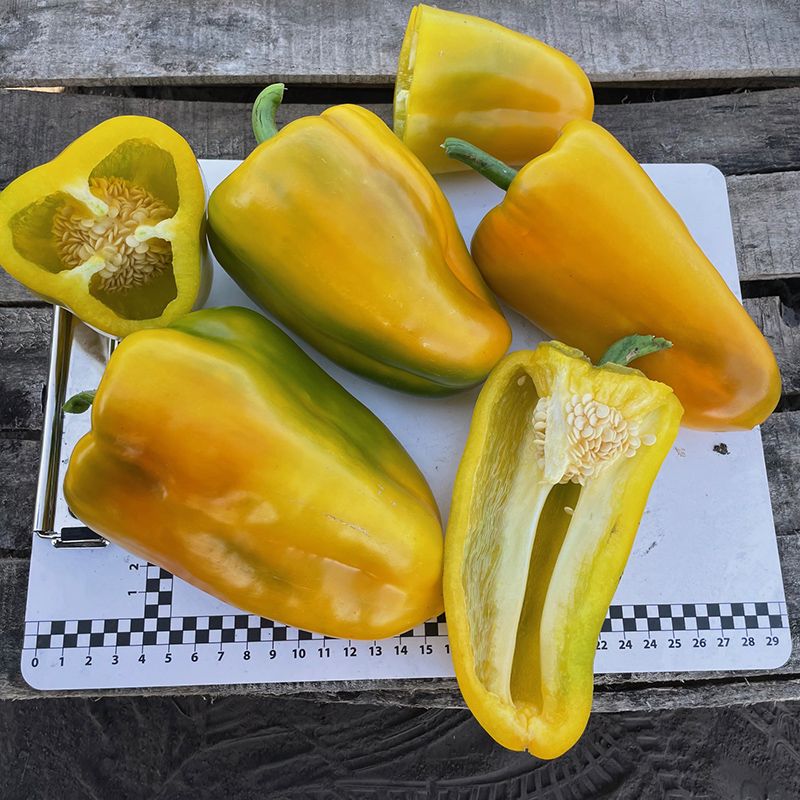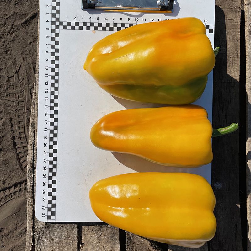 Характеристика плода – Плоды удлиненно-кубовидной формы. Толщина стенки плода – 7-9 мм. Длина – 16 см, диаметр – 9 см. В технической спелости имеют зеленый цвет, в биологической спелости – желтый. Вес плода – 180-220 г. Очень вкусный.