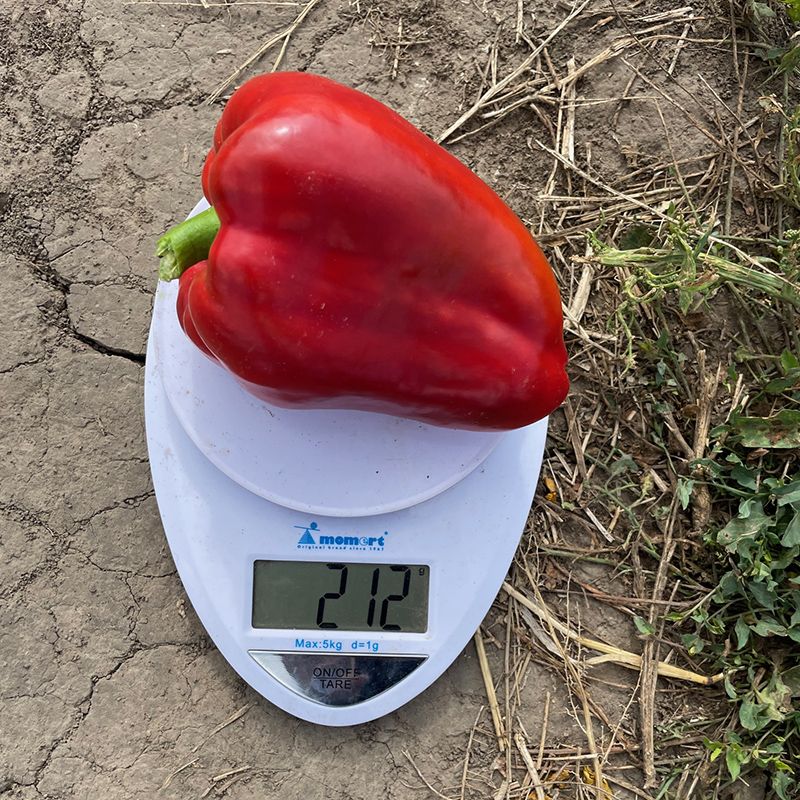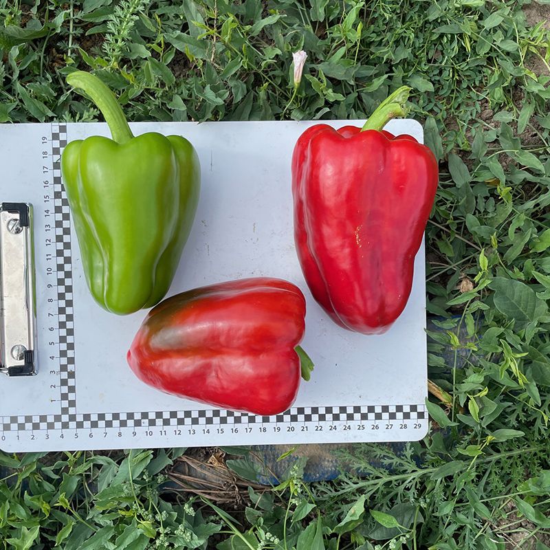 Характеристика плода – Плоды удлиненно-кубовидной формы. Толщина стенки плода – 7-9 мм. Длина – 16 см, диаметр – 9 см. В технической спелости имеют зеленый цвет, в биологической спелости – красный. Вес плода – 180-200 г.