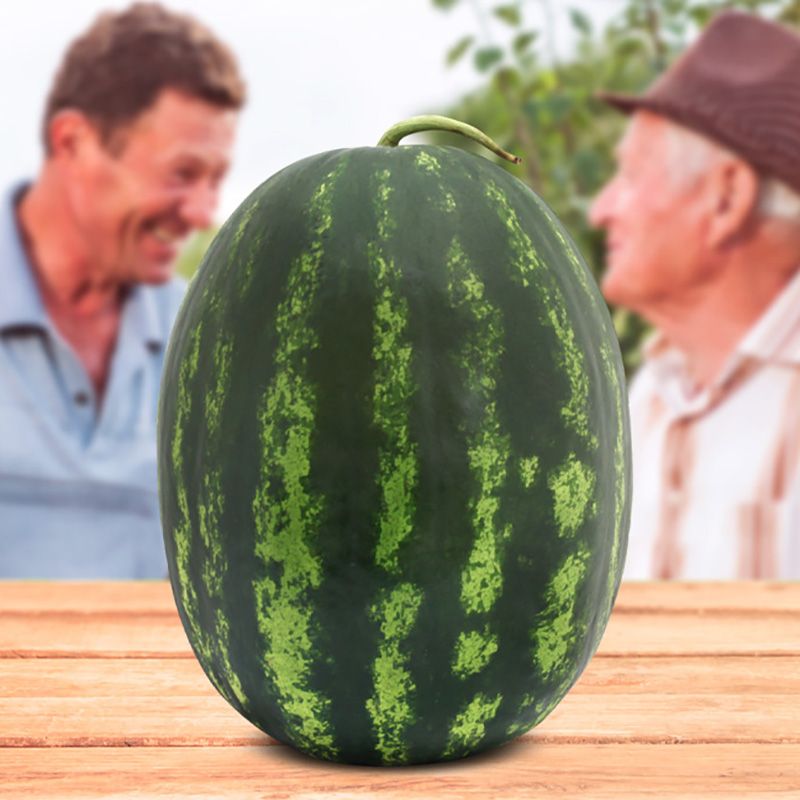 Характеристика плодов – Гибрид с крупными однородными плодами, весом 14-16 кг, округло-овальной формы. Обладает отличными вкусовыми качествами. Полосатая темно-зеленая кожура и красная мякоть.
