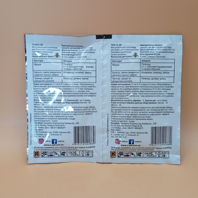 Инсектицид Темпо чрезвычайно толерантен по отношению к окружающей среде и имеет низкую токсичность для млекопитающих, полезных насекомых и пчел при соблюдении рекомендаций на этикетке.