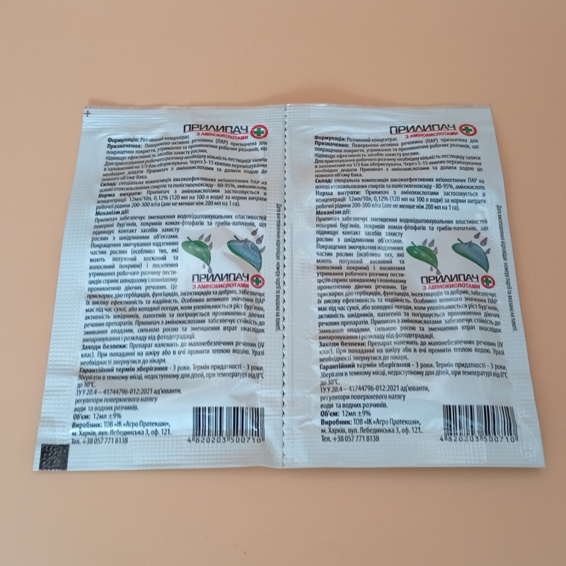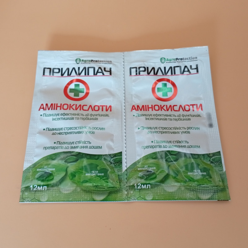 Прилипач с аминокислотами применяется в концентрации: 12 мл/10 л, 0,12% при норме расхода рабочей жидкости 2-3 л/сотку.