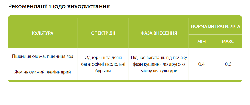 Послевсходовый гербицид системного действия для контроля однолетних и многолетних двудольных сорняков, падалицы рапса в посевах зерновых культур.