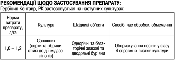 Системный гербицид для уничтожения широкого спектра однодольных и двудольных сорняков в посевах подсолнечника, а именно гибридов и сортов устойчивых к имидазолинонам.