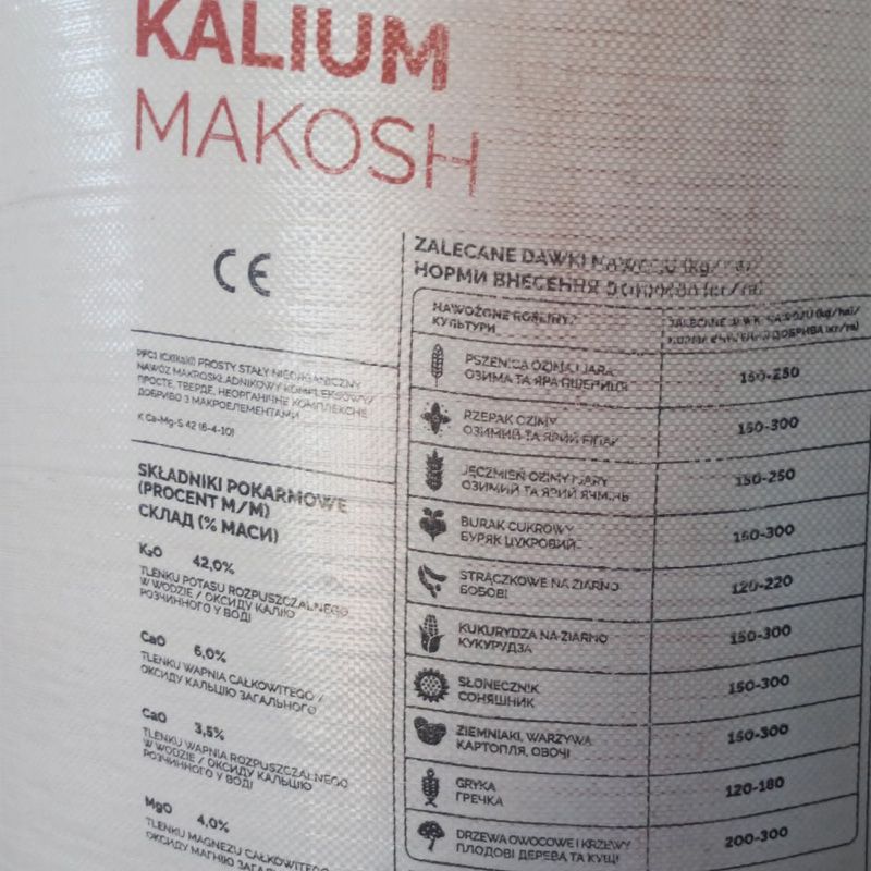 Kalium Makosh можно вносить в основную и предпосевную обработку почвы, но за месяц до посева культур, так как удобрение содержит Cl (особенно для культур, чувствительных к избытку хлора: гречиха, картофель, плодовые и овощные культуры).