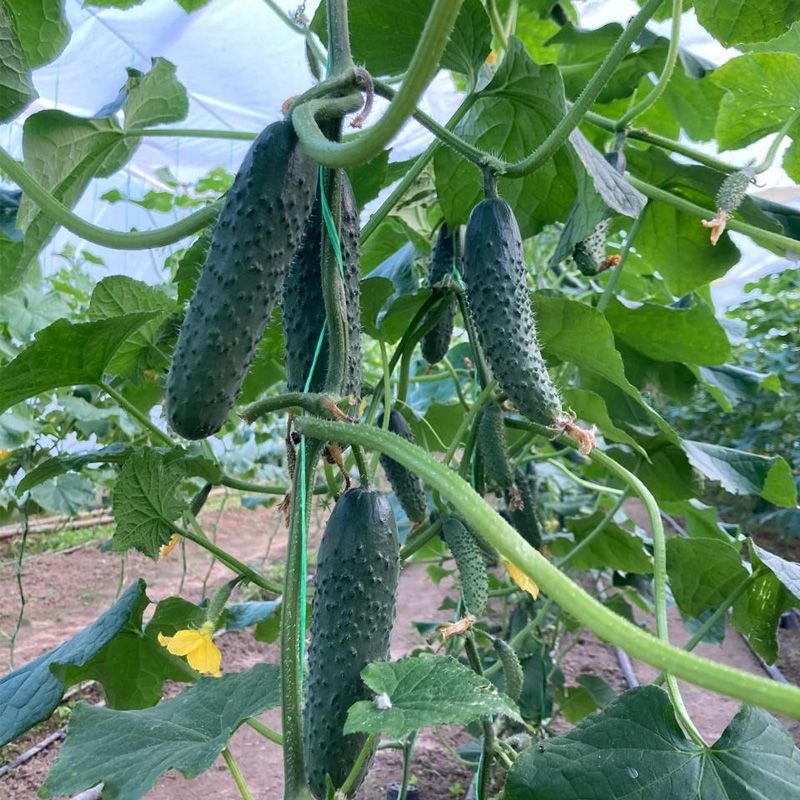 Насыщенно-зеленые плоды, средняя длина 12-14 см, в одном узле формируется 2-3 плода. Не теряет шипы до конца вегетации, даже в стрессовых условиях.