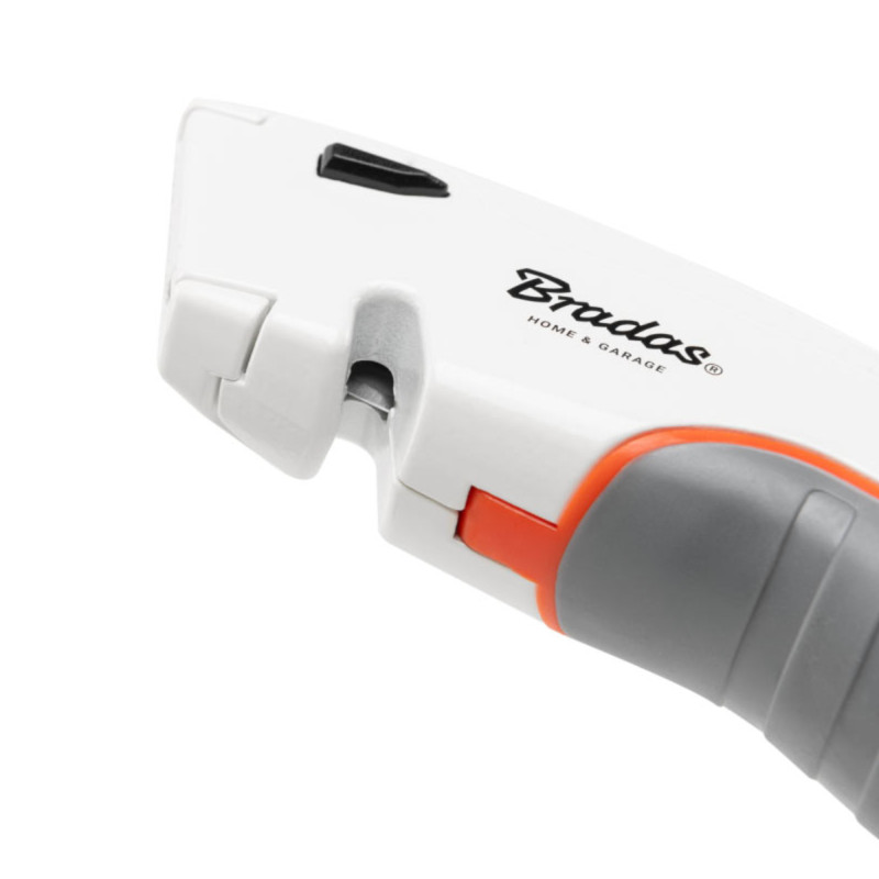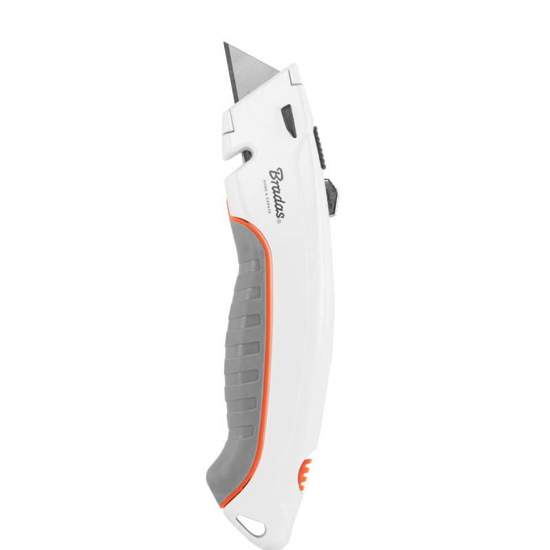 Механизм клик-стоп фиксирует лезвие в нужной позиции для безопасной и точной работы. Специальная функция резки шнуров и ремней делает нож незаменимым в аварийных ситуациях и при работе с тканями или ременными материалами. Встроенный магазин с тремя дополнительными трапециевидными лезвиями позволяет быстро заменить изношенный сегмент.