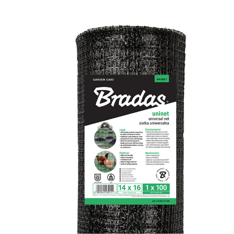 Гибкая структура с ячейками 14×16 мм позволяет легко адаптировать сетку под нужный рельеф или форму поверхности. Применяется для укрепления газонов, склонов, защиты от кротов, а также в качестве ограждения для мелких животных и птиц.