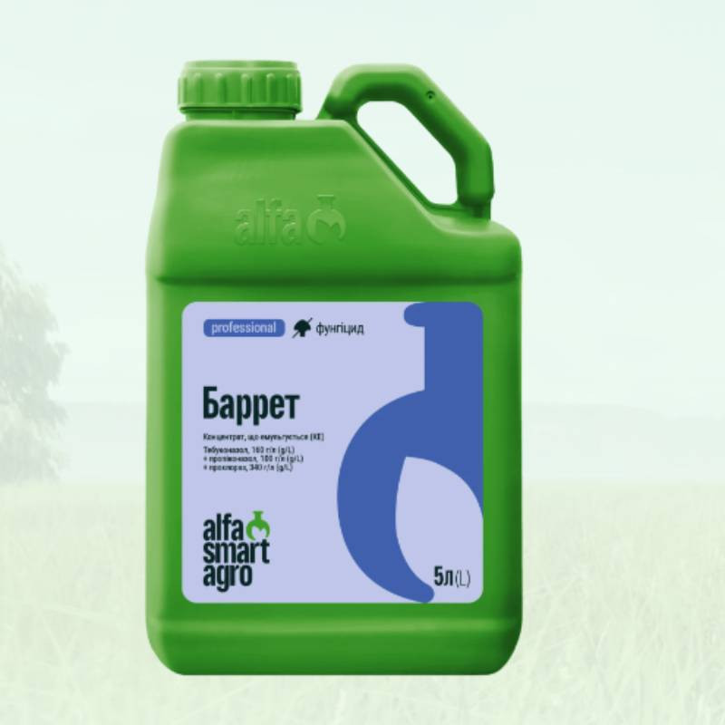 Фунгицид Баррет — новый трехкомпонентный препарат контактно-системного действия для комплексной защиты зерновых культур и подсолнечника от широкого спектра опасных заболеваний. Сочетание прохлораза, тебуконазола и пропиконазола обеспечивает длительную защиту до 4 недель, высокую эффективность даже при низких температурах и мощные лечебные и профилактические свойства.