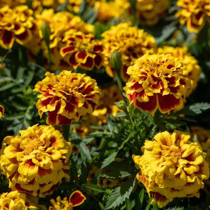Бархатцы раскидистые Манго Танго (Tagetes patula Mango Tango) — эффектный сорт французских бархатцев с крупными полумахровыми соцветиями контрастной окраски в красно-жёлтых тонах.