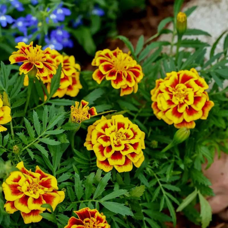 Низкорослые кустики высотой 20–25 см обильно покрыты двухцветными цветами, где тёплый жёлтый оттенок гармонично сочетается с насыщенным красным. Серия Манго Танго отличается ранним и продолжительным цветением, прекрасно подходит для горшков, вазонов и клумб. Растения легко переносят жару и отлично смотрятся на солнечных участках сада.