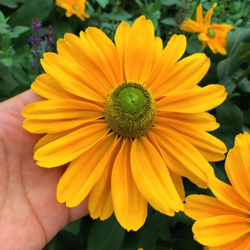 Впечатляет гигантскими ромашковидными соцветиями диаметром 10–15 см с насыщенными желтыми лепестками и крупным зеленым центром, привлекающим пчел, бабочек и колибри.
