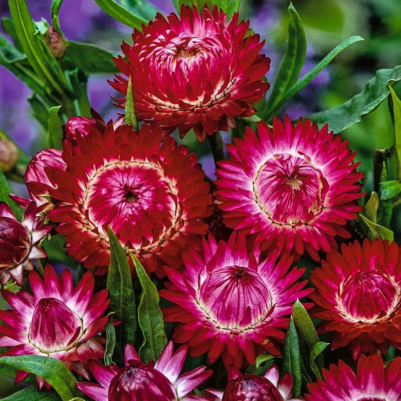 Этот бессмертник формирует аккуратные прямостоячие кусты, идеально вписываясь в цветники, где важен устойчивый цвет и длительная декоративность. Соцветия можно срезать на пике окраски и сушить в тени — лепестки останутся плотными и привлекательными.