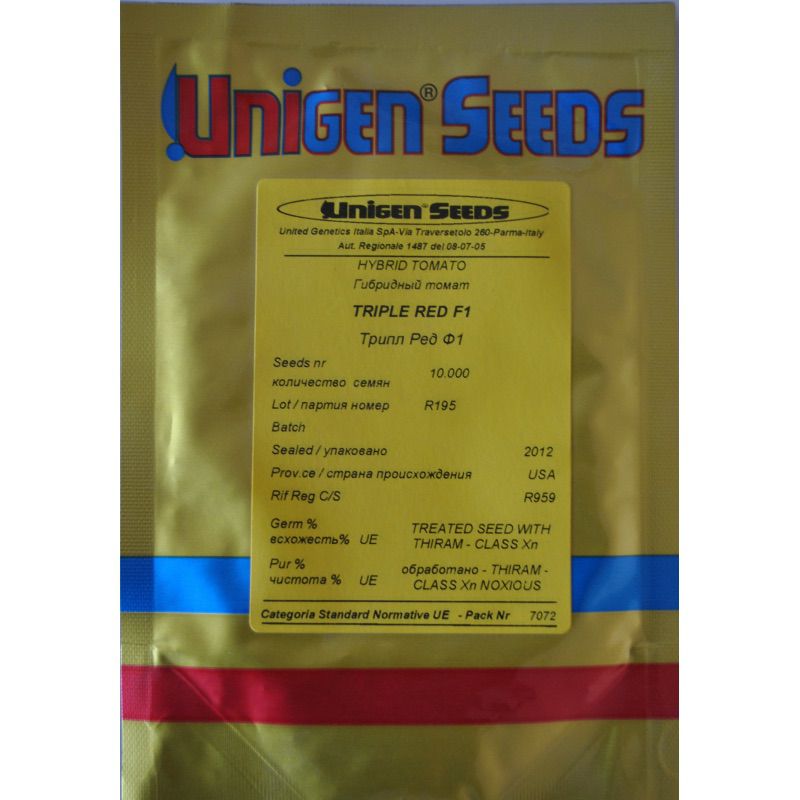 Трипл Ред F1 - среднеспелый гибрид детерминантного томата от компании United Genetics. Период вегетации от 80 до 85 суток. Хорошо подходит для выращивания на бедных и тяжёлых почвах. Плоды имеют округлую форму, насыщенный красный цвет, массу - 55-60 г, высокое содержание ликопена и сухих веществ. Отличная транспортабельность. Имеет устойчивость ко многим вирусам.