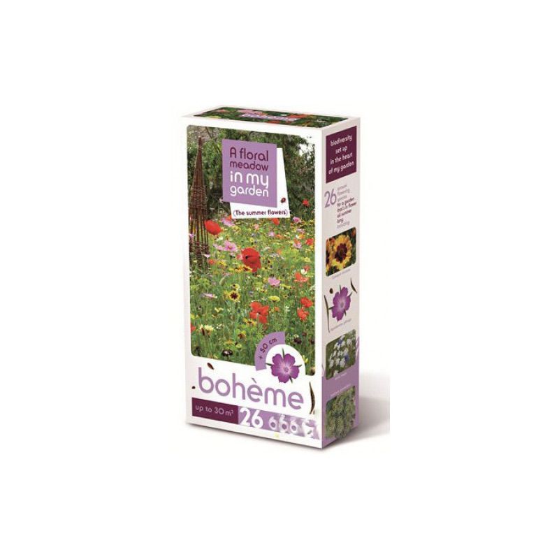 При раннем посеве в апреле, смесь предложит постоянно изменяющийся цвет с постоянным наличием мака. При более позднем посеве, в мае, клумба расцветет с обилием цветов и наличием циннии и зонтичных цветов. С помощью луговой смеси ярких и красочных цветов «Богемия» Вы сможете создать прекрасную клумбу из однолетних видов. Идеальный вариант, чтобы украсить один из уголков Вашего сада. Кроме того, из цветов можно будет создать прекрасный букет для дома в стиле кантри. Цветение начинается уже через 6-8 недель после посева и продолжается примерно 3-4 месяца.