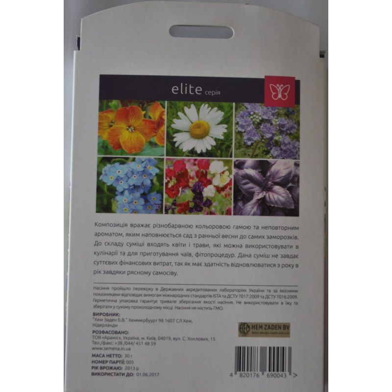 Композиция поражает разноцветной цветовой гаммой и неповторимым ароматом, которым наполняется сад с ранней весны до самых заморозков. В состав смеси входят цветы и травы, которые можно использовать в кулинарии и для приготовления чаев, фитопроцедур. Данная смесь не наносит существенный финансовых затрат, так как обладает способностью восстанавливаться из года в год благодаря обильному самосева.