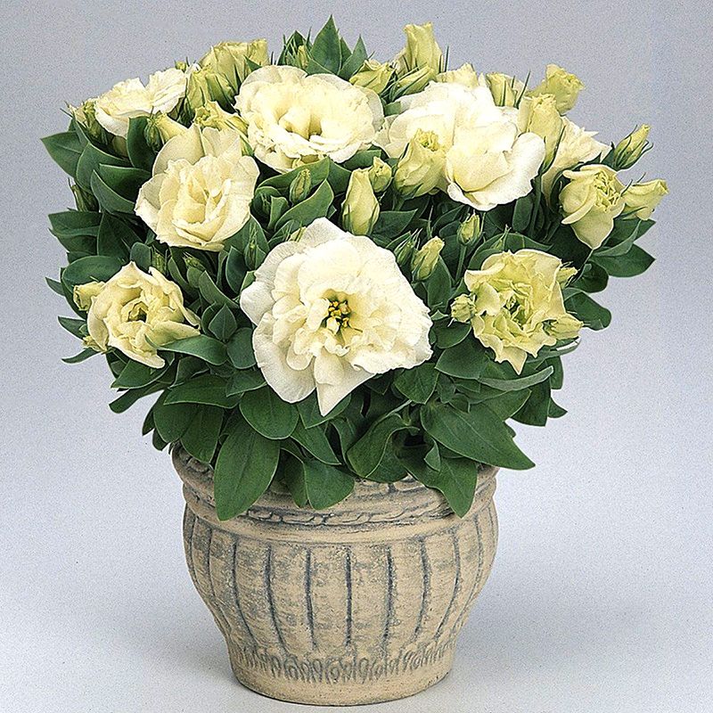 Эустома Сапфир F1 горшковая кремовая (Eustoma grandiflorum Sapphire F1) – серия Сапфир, которая выведена в США специально для выращивания в горшечной культуре и отличается компактным кустиком и продолжительным периодом цветения.