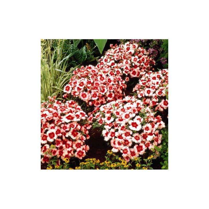 Гвоздика китайская Супер Парфайт F1 - генетически карликовый гибрид китайской гвоздики. Высота кустика - 15 см. Отличительной особенностью серии является очень крупный цветок с двойной окраской. Все растения выровнены по размеру и цветению. Зацветает через 15-18 недель после посева, цветет обильно и непрерывно все лето до заморозков. Прекрасный выбор для вазонов, может выращиваться как горшечная культура.