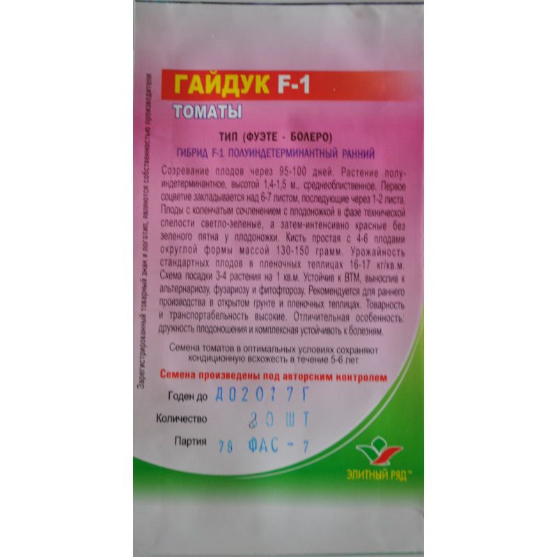 Созревание плодов через 95 – 100 дней. Растение полуиндетерминантное, высотой 1,4 – 1,5 м. среднеоблиственное. Первое соцветие закладывается над 6 -7 лисом, последующие через 1 – 2 листа. Плоды с коленчатым сочленением с плодоножкой в фазе технической спелости светло – зеленые, а затем – интенсивно красные без зеленого пятна у плодоножки. Кисть простая с 4 – 6 плодами округлой формы массой 130 – 150 грамм. Урожайность стандартных плодов в пленочных теплицах 16-17 кг/кв.м . Схема посадки 3- 4 растения на 1 кв.м. Устойчив к ВТМ, вынослив к альтернариозу , фузариозу и фитофторозу. Рекомендуется для раннего производства в открытом грунте и пленочных теплицах. Товарность и транспортабельность высокие. Отличительная особенность: дружность плодоношения и комплексная устойчивость к болезням.