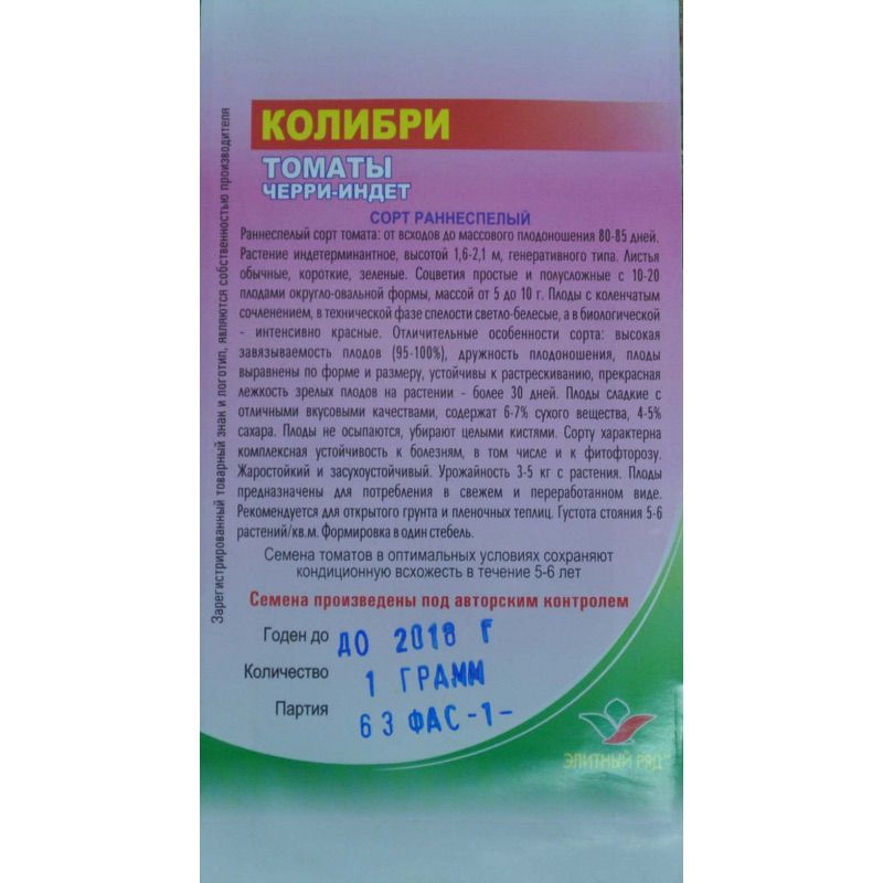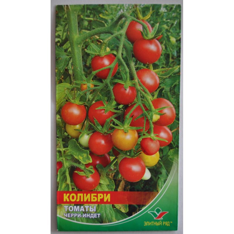 Коллибри - это раннеспелый сорт томатов черри-индет. До периода созревания около 90 дней, после всходов. Этот сорт очень высокий, 1,5 - 2 метра. Листья самые обычные: зелёные и короткие. Соцветия у Коллибри простые и полусложные с 10-20 плодами, у которых округлая и овальная форма. Плоды не осыпаются и убираются целыми кистями. Этот сорт засухо- и жаростойкий. С одного растения можно собрать от 3 до 5 килограмм. Растение можно выращивать как и в открытом грунте, так и в закрытом.