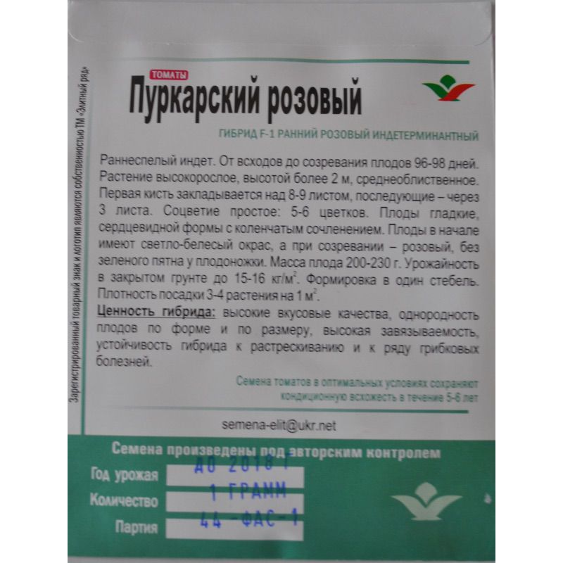 Пуркарский розовый F1 – это индетерминантный ранний гибрид томата. До созревания должно пройти около ста дней. Этот гибрид томата достигает высоты чуть больше ста дней. На 8 или 9 листе закладывается первая кисть, а через каждые 3 – последующие. Соцветие у этого томата простое с 5 или 6 цветами. Масса плода от 200 до 230 граммов. Этот гибрид устойчив к ряду грибковых заболеваний.