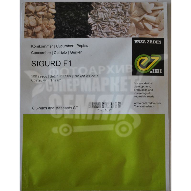 Ультраранний партенокарпический огурец для культивирования в парниках с поздней весны по лето, а также в поле. Срок созревания 40-45 дней. Сигурд F1 отличается сильными корнями, без проблем завязывает и не сбрасывает завязь при стрессах (к примеру, колебания температуры). В одной пазухе формирует по 1-2 зеленца. Плоды окрашены равномерно в темно-зеленый цвет крупнобугорчатые, достаточно твердые и транспортабельные. Огурчики весят 90-100 грамм, в длину 10-12 см, соотношение параметров - 3,2–3,3:1. Пригодны для употребления в свежем, солёном и маринованном виде. Толерантный к Ccu, Px, CMV, CVYV.