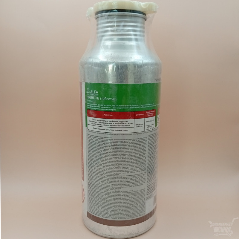 Компанией АльфаХимгрупп был создан фумигант под названием Джин, призванный защитить запасы от ряда вредителей. В составе препарата имеется активное вещество - фосфад алюминия. Данное активное вещество во время контакта с атмосферным воздухом распадается на фосфорный водород, углекислый газ с выделением амиака. Скорость данной реакции зависит от наличия влаги и температуры воздуха. При влажности воздуха 60% и при температуре +20 С - 50% газа выделяется в течении суток. Благодаря воздействию препарата нарушается процесс метаболизма и блокируется поступление кислорода в организм, вызывая при этом паралич нервной системы и непосредственную гибель вредителя.